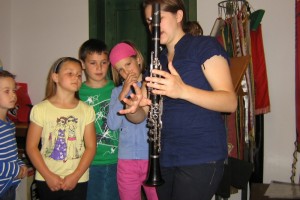 Nach diesen Lied versuchten die Kinder allerlei Holz- und Blechblasinstrumente sowie das Schlagzeug am hören zu erkennen, was meistens auch gelang. Die Instrumente wurden kurz vorgestellt, und im Anschluss daran durften die Kinder alle Musikinstrumente durchprobieren. Zu unserer großen Freude funktioniert das “Töne erzeugen” bei den meisten Kinder bravourös und auch die eine oder andere Lehrkraft versuchte ihr Glück.
