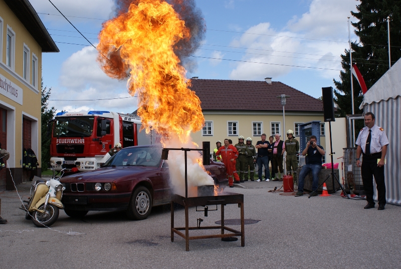 Zu Beginn wurde die Auswirkung der Bekämpfung eines Fettbrandes mit Wasser spektakulär dargestellt. Es war klar erkennbar, dass Wasser hier das absolut falsche Löschmittel ist! Bei der Rettung eines Unfallopfers aus einem Fahrzeug wurden die technischen Möglichkeiten des neuen TLFA 4000 gezeigt. Der zu Demonstrationszwecken gezündete Airbag des Unfallfahrzeuges erstaunte die Zuseher sowohl mit der Geschwindigkeit des Aufblasens als auch durch die Lautstärke.
