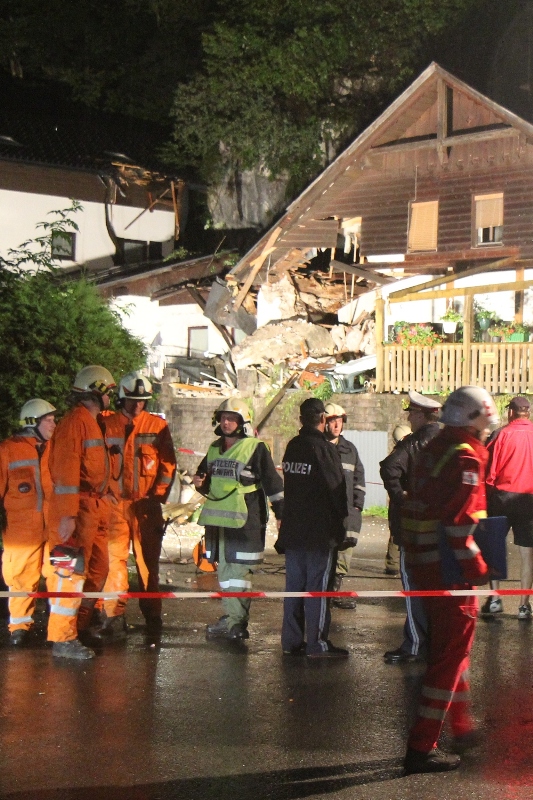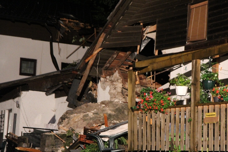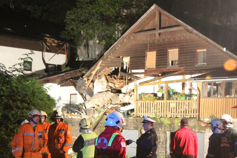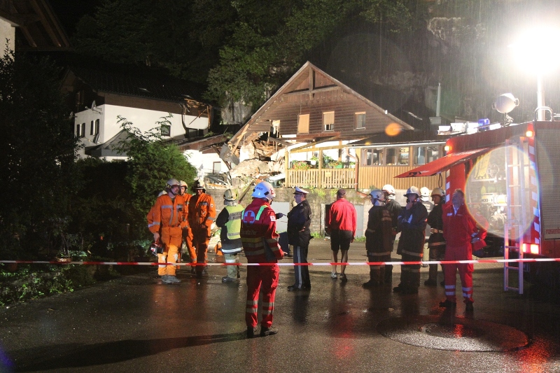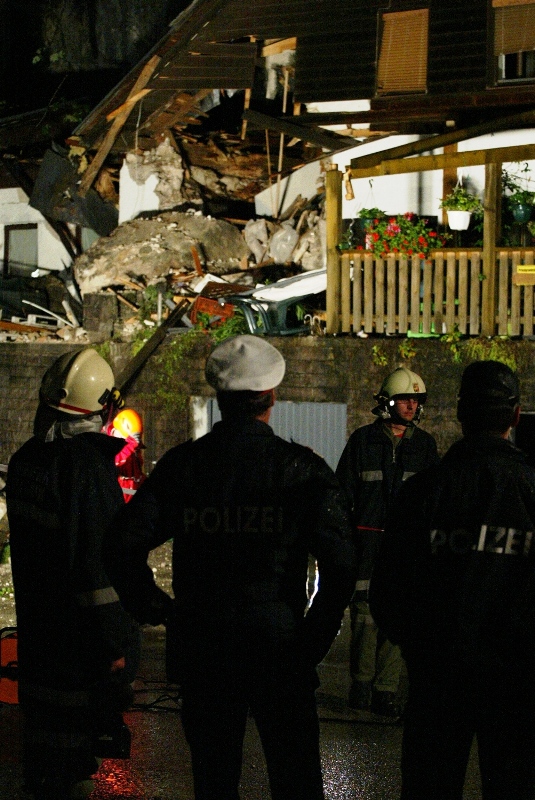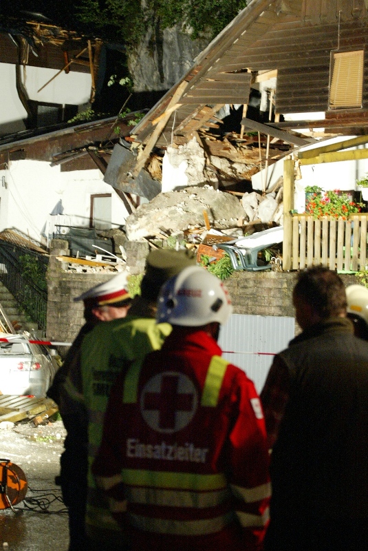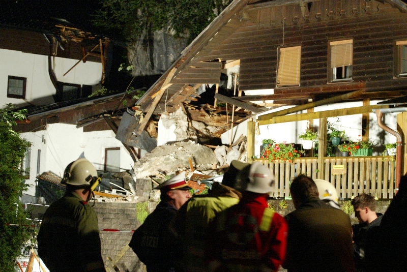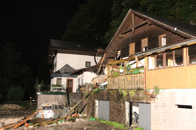 Ein rund 10 Tonnen schwerer Felsblock durschlug in der Nacht auf Dienstag in Obertraun (Bezirk Gmunden) das Wohnhaus in Obertraun 3. Sieben Personen und ein Baby riss um 00:30 Uhr ein lauter Knall aus dem Schlaf. Ein tonnenschwerer Felsblock löste sich oberhalb eines Mehrparteienhauses vom Wehrkogel (Grubberg) und fiel durch ihre Zimmer. Der PKW-große Felsen blieb auf der Terrasse des Hauses liegen. Sie mussten aus dem stark Einsturz gefährdeten Haus durch die Einsatzkräfte von Rotem Kreuz und der Freiwilligen Feuerwehren Obertraun, Hallstatt und Bad Goisern evakuiert werden.