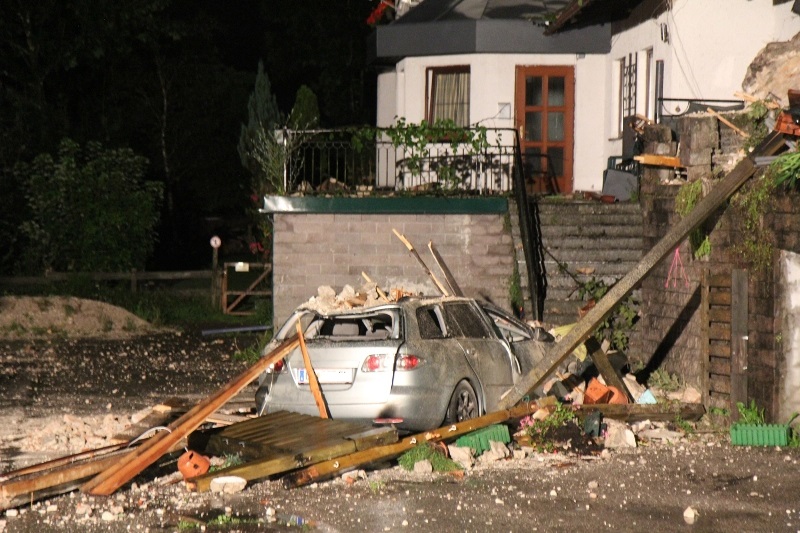 Weiters wurden zwei vor dem Haus geparkte Autos erheblich beschädigt. Eines dürfte sogar durch die Wucht weiterer herum fallender Steine so schwer beschädigt worden sein, dass es vermutlich ein Totalschaden ist. Das Dach des benachbarten Wohnhauses dürfte ebenfalls von einem Stein getroffen worden sein. Wie hoch die Gesamtschäden sind, steht noch nicht fest.