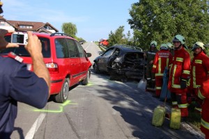 Die Einsatzkräfte von Feuerwehr und Rotem Kreuz wurden am Freitagabend zu einem Verkehrsunfall mit drei Fahrzeugen auf der Pettenbacher Straße in Vorchdorf (Bezirk Gmunden) gerufen. Entgegen den ersten Informationen war glücklicherweise niemand im Fahrzeug eingeklemmt, drei Fahrzeuge waren in den Unfall im Ortsteil Adlhaming verwickelt. Mit Verdacht auf einen Schädel-Basis-Bruch musste ein 2-jähriges Kind notärztlich erstversorgt und ins Krankenhaus gebracht werden. Fahrer und Beifahrerin kamen ebenfalls mit schweren Verletzungen ins Krankenhaus.