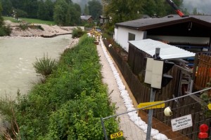 Die vorhergesagten schweren Regenfälle brachten die ausführende Baufirma, in Absprache mit dem Gewässerbezirk und die Feuerwehr Pfandl dazu, vorbeugend einen Hochwasserschutz aufzubauen. Die freiwilligen Feuerwehren Pfandl, Jainzen und Bad Goisern und die Feuerwachen Ahorn-Kaltenbach, Rettenbach und Perneck wurden um 17 Uhr alarmiert und begannen mit Sandsäcken den Damm zu erhöhen.