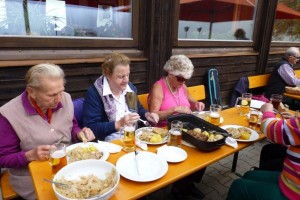 Mit der neuen Gondelbahn, einen tollen Panoramablick auf den Traunsee genießend ging es bergauf. Ein nebelfreier Blick ins Tal ließ uns in der Ferne sogar den Vorchdorfer Kirchturm erkennen. Nach einem kurzen Spaziergang erwartete uns im Gasthof Grünbergalm schon die Stärkung, ein „Bratl in da Rein“ das uns bestens mundete.Unterstützt von unserer Ehrenamtlichen Mitarbeiterin Theresia an der Gitarre erklangen einige frohe Lieder. Das ein oder andere „Witzerl“ durfte natürlich auch nicht fehlen.