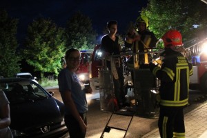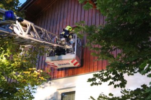 Die Bergung von gefährlichen Gütern aus dem Kellerbereich und der anschließend richtige Umgang war ein weiterer Schwerpunkt der Übung. Zwischenzeitlich wurde auch die Drehleiter DLK 23-12 zur Personenrettung aus dem 2. Obergeschoß in Stellung gebracht, wo mit einer Schiebeleiter keine Personenrettung mehr durchgeführt werden hätte können. Auch dieser Ausbildungsschwerpunkt zeigte seine Wichtigkeit einer regelmäßigen Übungs- und Schulungstätigkeit, da hier sehr viel Präzession und Fingerspitzengefühl des Korbmaschinisten und Obacht des Kraftfahrers am Hauptleitstand gefordert wurde.