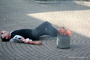 Als ein Atemschutztrupp zur Brandbekämpfung in den Chemiesaal vordrang, kam es zu einer Explosion, wobei ein Atemschutzträger schwer verletzt wurde. Sofort drang ein Rettungstrupp ebenfalls zum Brandherd vor, um den verletzten Kameraden zu retten. Zur selben Zeit sprang ein Schüler aus Verzweiflung aus dem Fenster und kam schwerverletzt im Innenhof der Schule zum Liegen