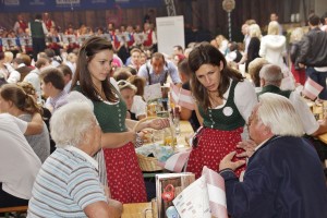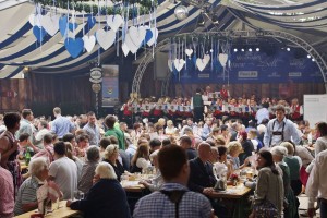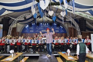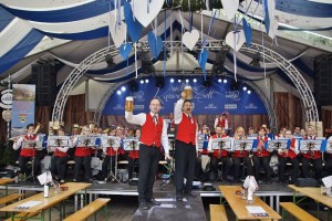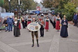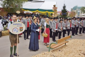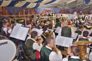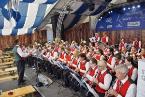 Aber vorher wurde beim Haupteingang Aufstellung genommen und dann fand der große Einmarsch zur Festbühne im Zentrum der Wies`n statt. Mit den Gmundner Musikern war auch eine Delegation Musikfreunde mitgefahren. Auch zwei Goldhaubenfrauen rundeten das Gesamtbild ab und wurden auch entsprechend bestaunt. Begleitet von hunderten Besuchern marschierten die drei Kapellen zum Festplatz, nahmen dann Aufstellung und spielten gemeinsam drei bekannte Märsche, wobei jeweils die Kapellmeister der drei Musikgruppen den Riesen Klangkörper dirigierten. Im Anschluss ging es dann in die Festzelte zum Frühschoppen.