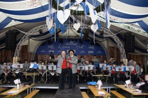 Dort erwarteten schon viele Gäste die Musiker und es ging gleich hurtig los. In kurzer Zeit füllte sich das 1200 Besucher fassende Festzelt und die Stimmung war sofort gegeben. Luigi THURNER betätigte sich nicht nur als Dirigent, sondern auch Conferencier und heizte den Festzeltgästen so richtig ein. Spätestens nach dem ersten “Ein Prosit der Gemüatlichkeit” standen zahlreiche Musikfans auf den Bänken, schunkelten, sangen und applaudierten. Eine Maß Bier nach der anderen fand den Weg auf die Musikbühne, um so ein Zeichen des Gefallen zu geben. Eine Besonderheit war auch das Festzelt, dass im Mittelteil eine durchsichtige Dachplane hatte, die den Blick auf das Riesenrat im Prater Preis gab.