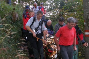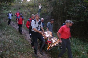 Zwei Bergrettungsmänner der Ortsstelle Ebensee nach kurzer Zeit den geschwächten Wanderer erreichten. „Es stand außer Frage, dass sich der Mann aus eigener Kraft weiter auf den Weg machen konnte“, erklärt Franz Scheck, der Sanitätswart der Ortsstelle Ebensee, „Wir informierten die Kammeraden, dass wir den Verunglückten, die 280 Höhenmeter bis zum Einsatzfahrzeug tragen müssen.“