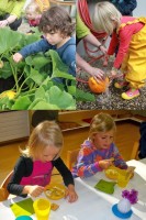 In der Praxis sieht dies so aus, dass neben der täglichen gesunden Bio-Jause auch regelmäßig gemeinsam gekocht wird – zum Teil mit selbst Angebautem aus dem eigenen Garten. Beim Mittagessen wird auf Ausgewogenheit geachtet und gemeinsam mit den Kindern besprochen und gewählt. Die Erde für Gemüse- und Blumenbeete stammt aus eigenem Kompost, das Mülltrennen ist klare Sache. Bewegung findet im Kinderhaus in jedem Raum statt, hauptsächlich aber im Bewegungsraum, im Garten oder bei Ausflügen in die nähere Umgebung.