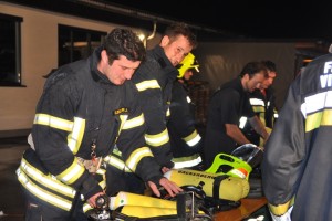 Gleichzeitig wurde der Innenangriff gestartet, die vermissten Personen gerettet und dem Roten Kreuz, Ortsstelle Scharnstein zur Versorgung übergeben. Während der Personenrettung wurde vom erstangreifenden Atemschutztrupp der Austritt von einem Gefahrenstoff in der Pulverbeschichtungsanlage festgestellt. In der zweiten Übungsphase galt es einen Tank mit ca. 400 Liter Gefährlichen Stoff mit einer Gefahrstoffpumpe umzupumpen und ins Freie zu transportieren. Für diese Tätigkeit wurden von 2 Atemschutztrupps die Schutzanzüge Schutzstufe 3 angelegt.