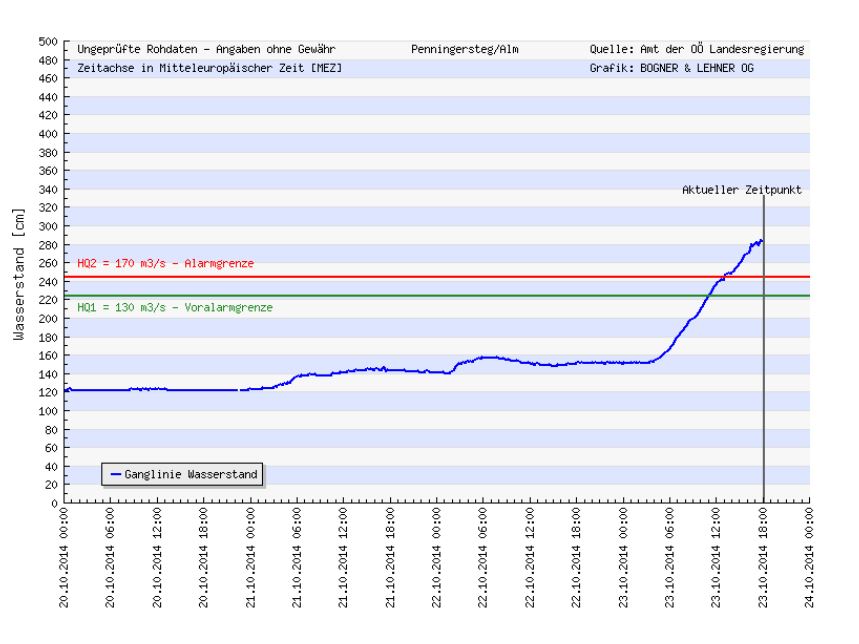 Aktueller Pegelstand Alm Penningersteg 290 cm (Höchstwert Hochwasser Juni 2013: 340 cm)