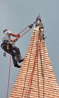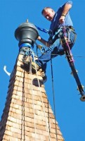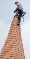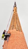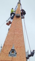 60 Quadratmeter Lärchenschindeln (etwa 5400 Stück) wurden in Dreifachdeckung am rund 35 m hohen Turm aufgebracht und davor auch der Dachstuhl des 1902 errichteten Spitzturmes teilweise erneuert.