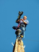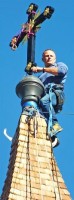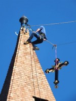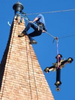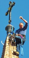 Gleichzeitig wurde auch das 1,5 m hohe Turmkreuz aus Nirosta renoviert, das seit 1984 anlässlich der Aussenrenovierung der Pfarrkirche in das Aurachtal grüßt und durch die Witterungseinflüsse schon etwas ramponiert war. Unter Beobachtung vieler Neukirchner Pfarrangehöriger und Beteiligung der Ortsvereines wurde die Aufbringung des Turmkreuzes zu einem Fest der Pfarrgemeinde und man verfolgte mit Herzklopfen und Nervenanspannung die Einsetzung des Turmkreuzes in luftiger Höhe. Stefan Ortner, der Mann „ohne Nerven“, schenkte sich zum Abschluss der „circensischen“ Kreuzaktion in luftiger Höhe auch noch ein Gläschen Sekt ein und prostete der ob dieser Leistung applaudierenden Zuschauermenge zu!