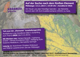 Der Verein Karamsel aus Seewalchen ist für seine außergewöhnlichen Ideen bekannt. Zur zweiten Station der Ausstellungsreihe „Auf der Suche nach dem fünften Element“ zum Thema „Erde“, die seit Anfang Oktober in der Konditorei Ottet in Schörfling zu sehen ist, veranstalten die kreativen Köpfe am 13. November ab 19.30 statt einer Vernissage eine „Midissage“ zugunsten des OÖ Zivil-Invalidenverbandes (OÖZIV).