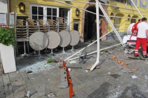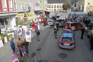 Ein schwerer Verkehrsunfall ereignete sich am 3. Oktober 2014 in Mondsee. Eine 91-jährige Pensionistin aus Mondsee lenkte ihren Pkw um 9:43 Uhr auf dem Marktplatz in Mondsee. Aus noch unbekannter Ursache verlor sie die Kontrolle über ihr Fahrzeug und raste dabei in eine Fußgängergruppe bzw. durch zwei Gastgärten eines Hotels und einer Pizzeria. Dabei riss sie mehrere Tische und Stühle, sowie die Markise samt Aufbau vor der Pizzeria um. Bei dem Unfall wurde ein Ehepaar aus Thüringen verletzt. Die schwer verletzte 68-jährige Touristin aus Deutschland musste mit dem „C6“ ins LKH Salzburg geflogen werden. Ihr verletzter 70-jähriger Ehemann wurde ebenfalls ins LKH Salzburg gebracht. Die Pensionistin und andere Personen blieben unverletzt. (Fotos: FF Mondsee)