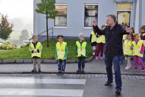 So auch in der Gemeinde Gschwandt, wo Bürgermeister Franz Wampl persönlich in die Musikvolksschule Gschwandt gekommen ist und insgesamt an 46 Kids die Warnwesten am 2.10.2014 übergeben hat. Auch Direktor Walter Kienesberger ließ es sich nicht nehmen und half bei Anziehen der Warnwesten mit und übte gleich vor der Schule das richtige Verhalten beim Überqueren der Straße mit seinen Taferlklasslern.