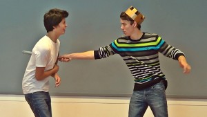 Er ließ sich nicht leicht zufriedenstellen, weshalb es oftmals “Take 1, take 2, take 3… no, do it again!“ hieß, bevor eine brillante Performance auf Film festgehalten wurde. Natürlich durften auch witzige Hoppalas (übrigens eines von Davids deutschen Lieblingswörtern, das er einfach auch auf Englisch benutzte – “Oh, that was a lovely ‚hoppala’!“) nicht fehlen: So etwa wurde im dramatischen Wortgefecht aus dem schottischen Rächer mit erhobenem Schwert Macduff plötzlich ein Macdeath (übrigens äußerst passend aus der Sicht seines entsetzten Gegenübers) oder die Biologie auf den Kopf gestellt („No woman born of a man can…“). Am Ende war es für alle ein lustiges, aber auch lehrreiches, aktives Theatererlebnis in der Fremdsprache!