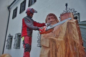 Auch der Samstag verlief nach Wunsch und wieder waren hunderte Besucher gekommen, sich auf die Weihnachtszeit einzustimmen. Speziell von der Stimmung in der Abenddämmerung und in den Abendstunden sind alle Gäste begeistert. Dieser Anblick ist und bleibt einfach einzigartig. Ebenfalls einmalig ist auch der Motorsägen Schnitzer Rudolf SCHINNERL aus Ried in der Riedmark, der aus einem riesigen Stamm eines Mammutbaumes den “Riesen Erla” aus der Traunstein Sage fertigt.