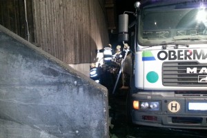 Ein Verkehrsunfall bei dem ein PKW durch ein Abbiegemaöver eines LWK´s zwischen LKW Anhänger und einer Stützmauer eingeklemmt wurde, war die Übungsannahme. Neben einem schwer eingeklemmten PKW Fahrer musste auch ein bewusstloser LKW Fahrer aus dem Führerhaus gerettet werden.
