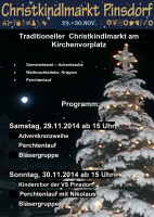 Am Freitag, den 29.11.2014 und Samstag den 30.11.2014 ab 15 Uhr findet wieder traditionell der Pinsdorfer Christkindlmarkt am Platz zwischen Gemeindeamt und der Kirchen statt. Die Aussteller bieten wieder allerlei Köstlichkeiten und handgemachte Kunstwerke.