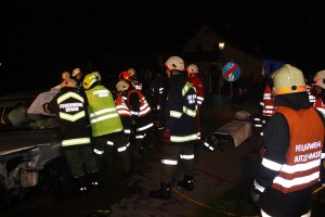 Ein Großaufgebot an Feuerwehreinsatzkräften war nach wenigen Minuten am Einsatzort. Sofort wurde das hydraulische Rettungsgerät (Spreizer und Schere) in Stellung gebracht und versucht, den verunfallten Fahrzeuglenker aus seiner misslichen Lage zu befreien. Eine zufällig vorbeikommende praktische Ärztin sowie der Feuerwehrarzt kümmerten sich sofort um den eingeklemmten Lenker. Der Fahrer des anderen Fahrzeuges konnte selbst aus dem Unfallfahrzeug aussteigen.