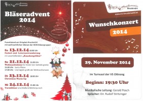 Der Musikverein Bruckmühl lädt alle Musikbegeisterten zum Wunschkonzert am 29.11.2014 um 19:30 Uhr in den Turnsaal der Volksschule Ottnang ein. Vor dem Konzert so wie auch in der Pause werden Sie mit einem kleinen Snack und kühlen Getränken versorgt. Eintrittskarten sind bei jedem Musiker und an der Abendkassa erhältlich.