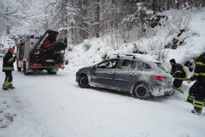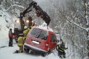 Bereits bei der Anfahrt zum eigentlichen Einsatzort musste man einen PKW-Lenker mit seinem Fahrzeug mittels Manneskraft aus dem Straßengraben befreien. Nachdem man am Einsatzort angekommen war, wurde das Unfallfahrzeug mittels des Kranes des schweren Rüstfahrzeuges aus seiner misslichen Lage befreit. Der Lenker darf von Glück sprechen, nicht über eine steile Böschung gestürzt zu sein.