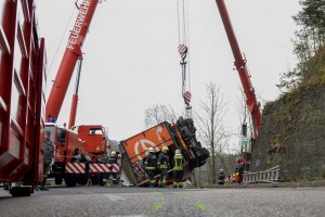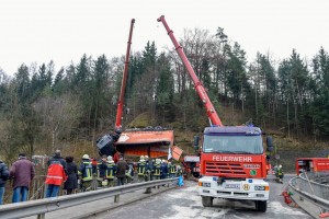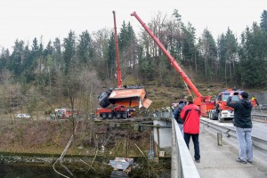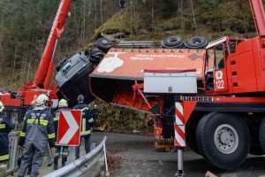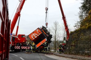Als der Anhänger vom Zugfahrzeug getrennt war, wurde mit Hilfe des Bergekranes der FF Vöcklabruck der Anhänger aufgehoben und mit einer Seilwinde zurückgezogen. Danach konnte die Zugmaschine weiter gesichert und fertig ausgeräumt werden. In der Zwischenzeit traf der zweite Bergekran der FF Wels am Unfallort ein. Nach dem beide Kräne aufgestellt waren, hievten beide in Zentimeterarbeit den Lkw nach oben. Danach wurde dieser auf die Räder gestellt und einem Abschleppunternehmen übergeben. Die Reinigung der Straße wurde im Anschluss abgeschlossen und die Landesstraße nach knapp 10 stündiger Sperre wieder für den Verkehr freigegeben.