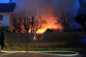 Die Hitzeentwicklung der beiden brennenden PKW in dem Carport war derart enorm, dass das Feuer auf die angrenzende Garage übergriff. Ein darin eingestelltes KFZ konnte gerettet werden, es wurde durch den Besitzer nach Brand aus der Garage gefahren. Das benachbarte Wohnhaus konnte durch Einsatz von mehreren Rohren, darunter 2 Schaumrohren, geschützt werden, obwohl durch die Hitzeentwicklung Fenster zersprangen und die Fensterstöcke deutliche Brandspuren aufwiesen.