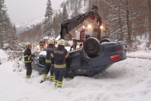 Am Sonntag, 26.01.2015 um 14.40 Uhr wurden die Kameraden der Freiwiligen Feuerwehren Mitterweißenbach und Bad Ischl zu einer Fahrzeugbergung im Weißenbachtal gerufen. Ein Fahrzeuglenker kam mit seinem PKW von der Fahrbahn ab und stürzte über eine Böschung, nach mehreren Überschlägen kam das Fahrzeug schließlich am Dach zum Liegen. Der Lenker blieb dabei unverletzt.