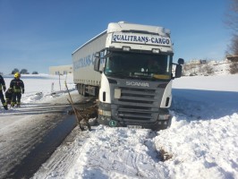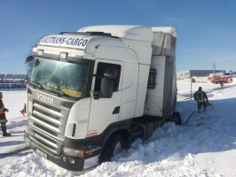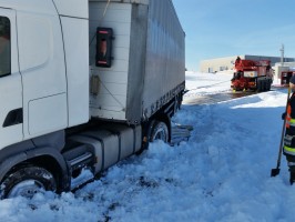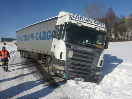 Ein Sattelzug war von der eisigen Fahrbahn abgekommen und neben der Straße zum stehen gekommen. Mit der 20 Tonnen Seilwinde wurde der LKW schonend auf die Straße gezogen. Mit einer Seilwinde eines Traktors konnte der Sattelzug gegen kippen gesichert werden. Kurz darauf wurde die Kranmannschaft zu einer weiteren Hilfeleistung im Werksgelände der Lenzing AG gerufen.