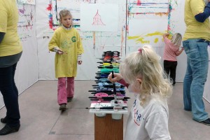 Geduldig warten sie, bis die Lehrerin ihnen ihr Papier an der Wand befestigt hat, dann beginnen sie zu malen. Jedes Kind, wonach ihm gerade ist. Dafür steht ihnen in der Mitte des Raumes ein Palettentisch mit achtzehn leuchtenden hochwertigen Farben zur Verfügung. Achtsam und geordnet gehen sie miteinander und mit dem Material um! „Diese Stunde im Malort ist ein Genuss für uns alle.“ sagt die Lehrerin freudig. „In diesem besonderen Raum dürfen wir alle gemeinsam einfach sein. Jede/r so wie sie/er ist. Der Malort hat es uns möglich gemacht viele Kinder außerhalb des „normalen“ Musters zu entdecken. Da erlebten wir wirklich ganz viele positive Überraschungen, gerade bei Kindern, welche wir sonst als „schwierig“ erlebten. Sie sind im Malort wie ausgewechselt!“
