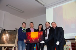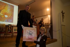Das System der „amerikanischen Versteigerung“, wobei immer in 5 Euro Schritten mitgeboten wurde, bewährte sich sehr. So konnte man auch mit einem geringen Einsatz ein Bild nach Hause tragen. Nicht nur Bilder wurden mitgenommen auch gute Laune und geselliges Beisammensein bei Kaffee, Kuchen Snacks und Getränken, kamen nicht zu kurz. So konnten Christian und Dieter nach 3 stündiger kabarettistischer, aber auch anstrengender Moderation dem Hausherrn KonsR. Pfarrer Franz Hörtenhuber mehr als 2.800 Euro als Spende für das Pfarrheim Regau übergeben. Ein herzlicher Dank allen Künstlern und allen Anwesenden, die dieses einmalige, unterhaltsame Erlebnis mitgetragen und so fleißig mitgesteigert haben!