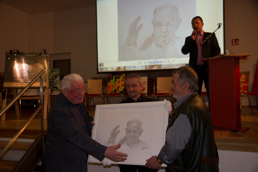Das System der „amerikanischen Versteigerung“, wobei immer in 5 Euro Schritten mitgeboten wurde, bewährte sich sehr. So konnte man auch mit einem geringen Einsatz ein Bild nach Hause tragen. Nicht nur Bilder wurden mitgenommen auch gute Laune und geselliges Beisammensein bei Kaffee, Kuchen Snacks und Getränken, kamen nicht zu kurz. So konnten Christian und Dieter nach 3 stündiger kabarettistischer, aber auch anstrengender Moderation dem Hausherrn KonsR. Pfarrer Franz Hörtenhuber mehr als 2.800 Euro als Spende für das Pfarrheim Regau übergeben. Ein herzlicher Dank allen Künstlern und allen Anwesenden, die dieses einmalige, unterhaltsame Erlebnis mitgetragen und so fleißig mitgesteigert haben!