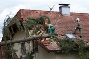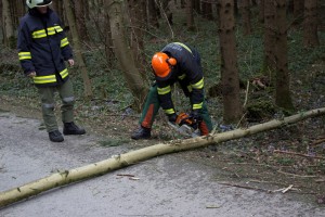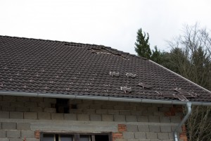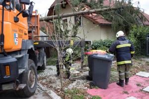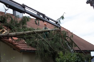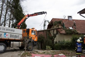 Am schlimmsten erwischte es ein Haus am Ehrendorfer Wald. Hier stürzte ein Baum über die Straße direkt auf das Hausdach. Zum Glück gab es keine Verletzten Bewohner bzw. Passanten im Umkreis. Nach dem zwei Mann mit Sicherungsausrüstung auf das Dach stiegen, wurde der Baum in kurze Stücke zersägt und mit dem Kranfahrzeug der Gemeinde Ohlsdorf vom Dach gehoben.