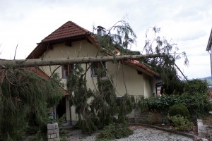 Nach fast zwei stündiger Arbeit war der Baum vom Dach entfernt und der ganze Schaden kam zum Vorschein. Zum Glück blieb das Dachfenster beim Aufprall des Baumes intakt, aber der Dachvorsprung und weitere Teile des Dachstuhles sind stark beschädigt.