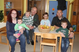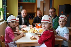 Die Kindergärtnerinnen des Pestalozzikindergartens in Vöcklabruck konnten im Oktober die Auszeichnung „Gesunder Kindergarten“ entgegen nehmen. GR. Thomas Pamminger besuchte mit Bürgermeister Mag. Herber Brunsteiner und einige Fraktionsmitglieder mit einem Obstkorb den Kindergarten, und bereiteten mit den Kindern einen Obstsalat zu. (Fotos: privat)