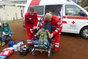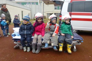 Alle Kinder hatten so die Möglichkeit, alles ganz genau zu erforschen, so zum Beispiel: ins Rettungsauto klettern, die Sirene einschalten, auf der Tragbahre liegen, sich im Tragsessel herumführen lassen, Warnwesten und Helme anziehen, Verband anlegen, usw…. Auch hier hatten die Schülerinnen der 2.Bakip die Möglichkeit, dabei zu sein und die Kinder zu begleiten. Sie konnten als angehende Kindergartenpädagoginnen dieses Projekt kennenlernen und es wäre schön, wenn sie es in ihrer späteren Arbeit im Kindergarten integrierten, indem sie sich an das Rote Kreuz wenden und Erste Hilfe so zu einem zentralen Thema bereits im Kindergarten machten. (Fotos: privat)