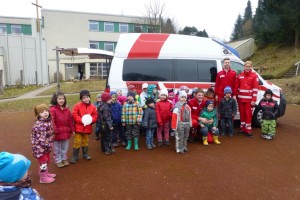 Zuvor wurden die Kinder bereits bestens mit dem Thema „Erste Hilfe“ von ihren Kindergartenpädagoginnen vertraut gemacht, dabei wurde sehr viel schon im Vorfeld mithilfe der vom Roten Kreuz zur Verfügung gestellten Materialen rund um „ROKO“ erarbeitet. Als Highlight des Projekts kam dann am 23. März noch das Rettungsauto samt zwei sehr netten jungen Sanitätern auf Besuch und parkte mitten auf unserem Sportplatz.
