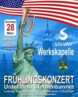 Kenner der Solvay Werkskapelle dürfen mit Spannung einen abwechslungsreichen und mitreißenden Konzertabend erwarten: Zum heurigen Frühlingskonzert gibt es von diesem Ebenseer Traditionsorchester unter der Leitung von August Auinger ausschließlich Musik aus und über Amerika zu hören. Zur Einstimmung auf echtes amerikanisches Flair wird die eigene Dixie-Band der jazzerfahrenen Kapelle die Konzertbesucher schon im Foyer des Ebenseer Rathaussaals musikalisch begrüßen. Den gemütlichen Ausklang mit Buffet und Getränken nach dem Konzert bestreitet die „Roither Feuerwehrmusik“.