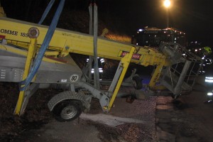 Unter Einsatz des Ladekrans des Wechselladefahrzeuges und der Einbauseilwinde des Rüstlöschfahrzeuges wurde die Arbeitsbühne wieder auf die Räder gestellt. Die Florianis reinigten die Unfallstelle und beseitigten ausgelaufenes Betriebsmittel. Anschließend wurde das Arbeitsgerät wieder an das Zugfahrzeug angehängt und der Fahrer konnte seine Fahrt wieder fortsetzten.