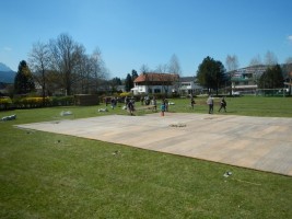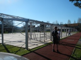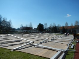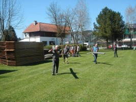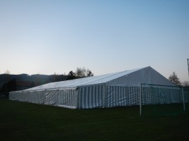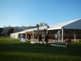 Unter Anleitung des Zeltverleihers wurde anfangs der Boden und anschließend die unzähligen Einzelteile der Zeltkonstruktion ausgelegt, zusammengebaut und aufgestellt. Zum Abschluss wurden sämtliche Zeltplanen eingezogen und aufgehängt. Nach 7 stündiger Schwerstarbeit war um 20:00 Uhr der Zeltaufbau abgeschlossen.
