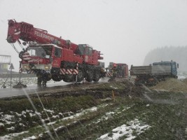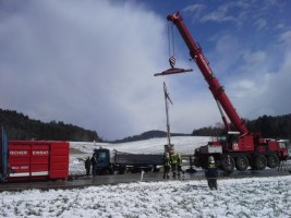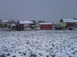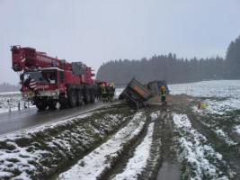 Kurz vor Mittag wurde die Feuerwehr Steining von der Landeswarnzentrale zu einer LKW Bergung nach Hintersteining alarmiert. Bei starken Graupel Schauern kam ein 3 Achser mit Hänger von der Straße ab und blieb auf der Seite liegen. Nach dem Eintreffen am Unfallort wurde durch den Einsatzleiter Kran Vöcklabruck alarmiert.