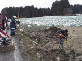 Nach der Totalsperre der L 509 wurde der geladene Sand abgeschaufelt und Hänger als auch Zugmaschine mittels Kran aufgestellt. Nachdem abtransportieren des verunfalltent LKW wurde die Straße gesäubert und das Bankett abgesichert. Im knapp 5 stündigen Einsatz standen 17 Mann der Feuerwehr Steining.