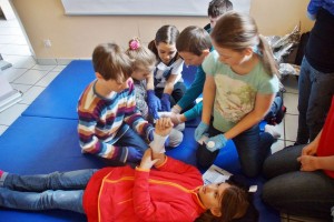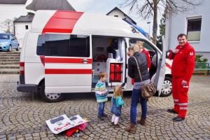 Ein Rettungsfahrzeug des roten Kreuzes war ebenfalls vor Ort und konnte genauestens inspiziert werden. In der Vorhalle war eine Mitarbeiterin des Jugend,- und Kinderrotkreuzes anwesend und da durften sich die Kids als Ersthelfer beweisen. Sie taten dies mit Begeisterung und versorgten Schnittwunden mit fachgerecht angelegten Verbänden.