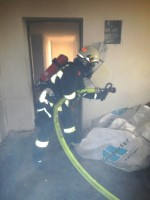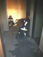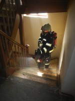Mit einem über das Stiegenhaus vorgetragenen Innenangriff mussten die Atemschutztrupps einen Zimmerbrand im Obergeschoss bekämpfen. Durch das Verheizen von Obstkisten simulierten die Übungsleiter Temperaturen, wie sie auch im tatsächlichen Einsatz vorzufinden sind und verrauchten die gesamte Wohnung.