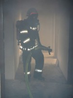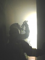 Eine besondere Herausforderung für alle Übungsteilnehmer war die Suche mit der Wärmebildkamera nach einer vermissten Person in den weitläufigen Kellerräumen. Der Rauch aus dem Nebelgerät sorgte dafür, dass man die Hand vor den Augen nicht mehr sehen konnte. Tastend mussten sich die Atemschutzträger vorwärts arbeiten, bis der Vermisste schließlich gefunden wurde.