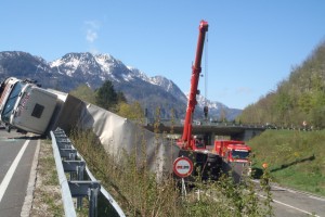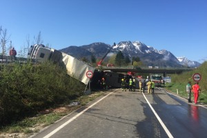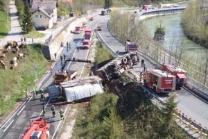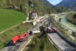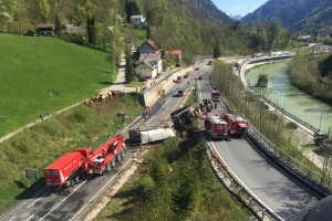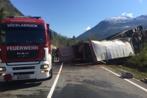 Ein Tiertransporter wollte auf die Abfahrt am Knoten Nord in Richtung Ebensee abfahren. Aus bisher unbekannter Ursache brach der Anhänger des Fahrzeuges in der Rechtskurve aus. In weiterer Folge stürzte der Anhänger über eine steile Böschung bzw. überschlug sich das Zugfahrzeug.