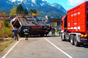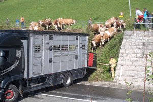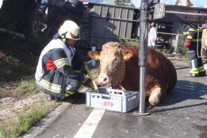 Ein entgegenkommender LKW konnte rechtzeitig bremsen. Die Nachkommenden Verkehrsteilnehmer veranlassten den Notruf. Der Lenker des Tiertransporters wurde nur leicht verletzt.