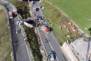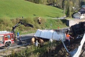 Unverzüglich wurde mit der Rettung von im Zugfahrzeug bzw. im Anhänger eingeschlossenen bzw. unter dem Anhänger eingeklemmten Tieren begonnen. Das Zugfahrzeug des Tiertransporters wurde mittels der Seilwinden von „Rüstlösch Bad Ischl“ und „Pumpe Pfandl“ gesichert, um auch für die Einsatzkräfte der Freiwilligen Feuerwehren eine sichere Rettung zu gewährleisten.